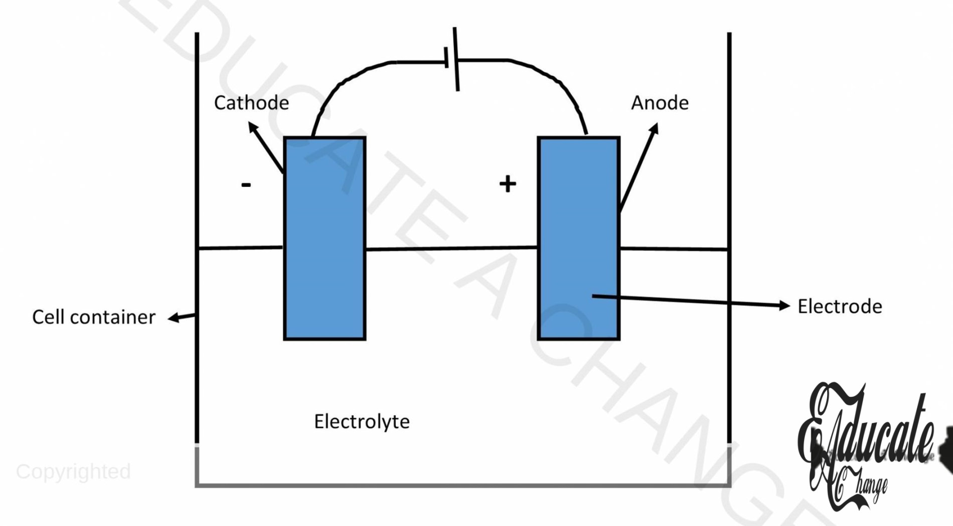 Cathode is the electrode/metal plate that is connected to the negative terminal of the cell. Cathode is electron rich and hence, the positive ions are attracted to the cathode where they gain electron and become atoms.