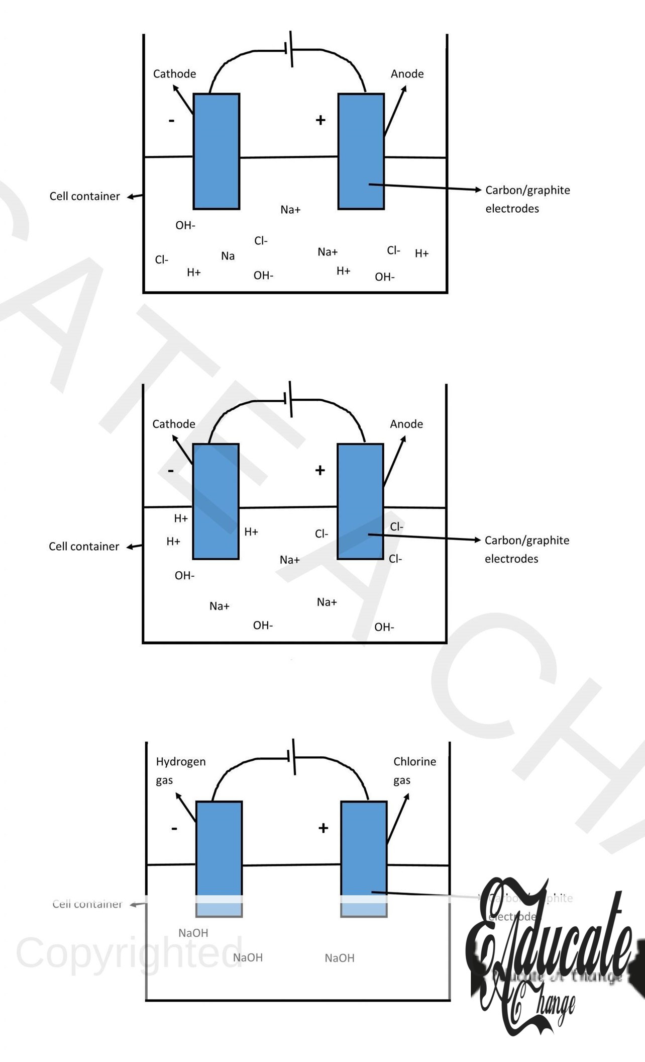 Cl– →Cl + e– Cl + Cl → Cl2 (a yellowish green gas will evolve)