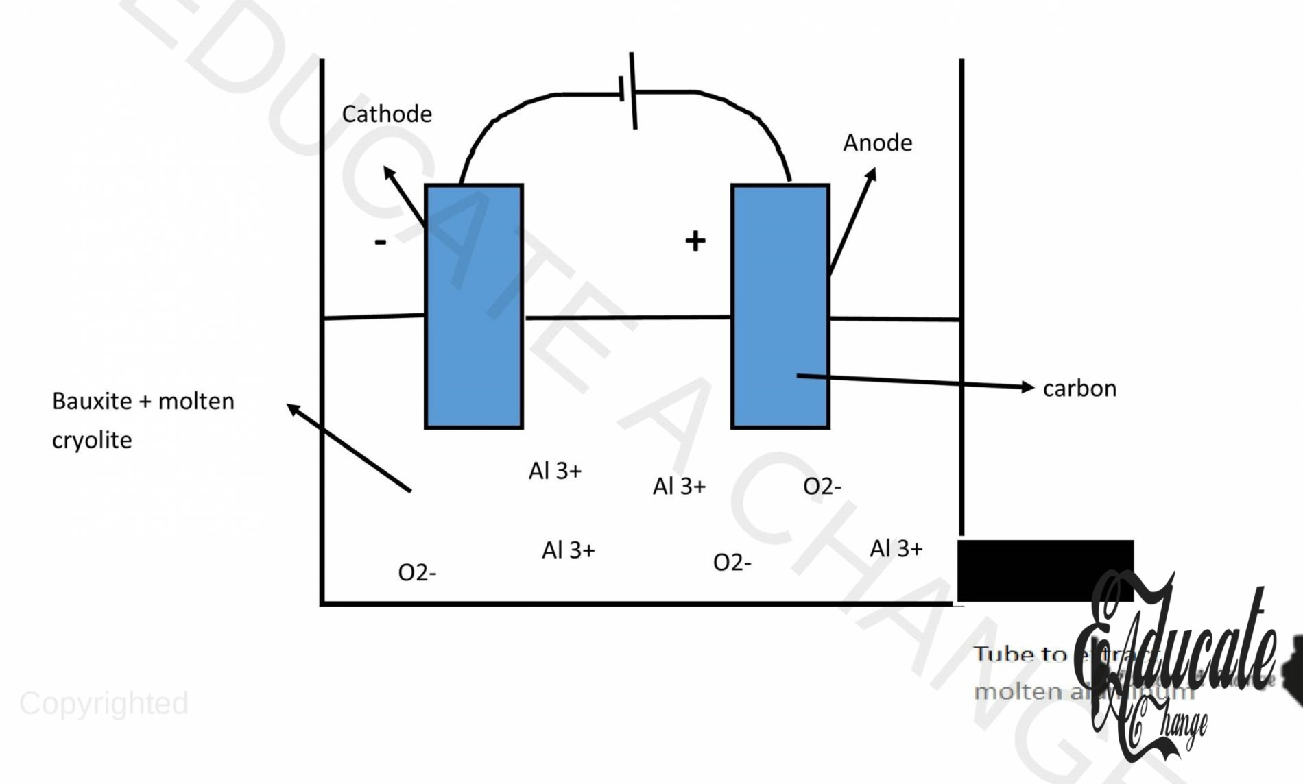 - At the cathode, aluminum ions receive electrons and turn into aluminum. Since aluminum has a charge of 3+, it takes in 3 electrons for each atom.: