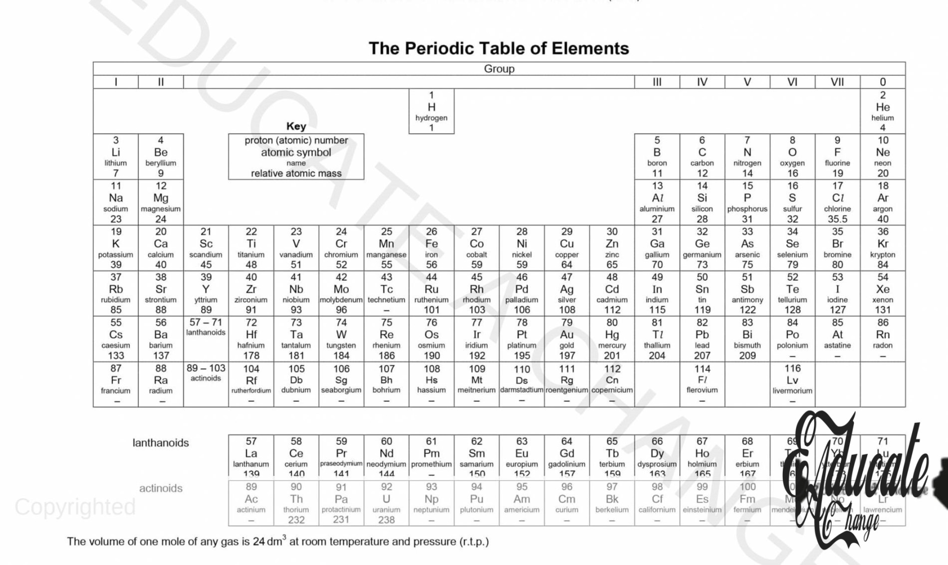 Different tables have different symbolic representation. A common representation is with the symbol of the element together with its proton and mass number. The kind of periodic table provided in CIE is given below, with the proton number on top and mass number below the symbol: