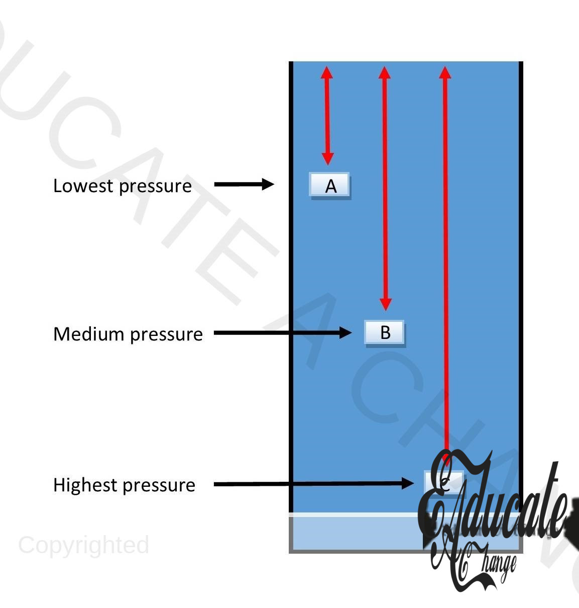 - Consider the above liquid column. Three objects are at three different heights in the column A, B and C. As we can see by the red lines, the height from A to top is the lowest among the three, it means that object A has the least pressure being applied on it. C is at the most depth, so the pressure is highest there.
