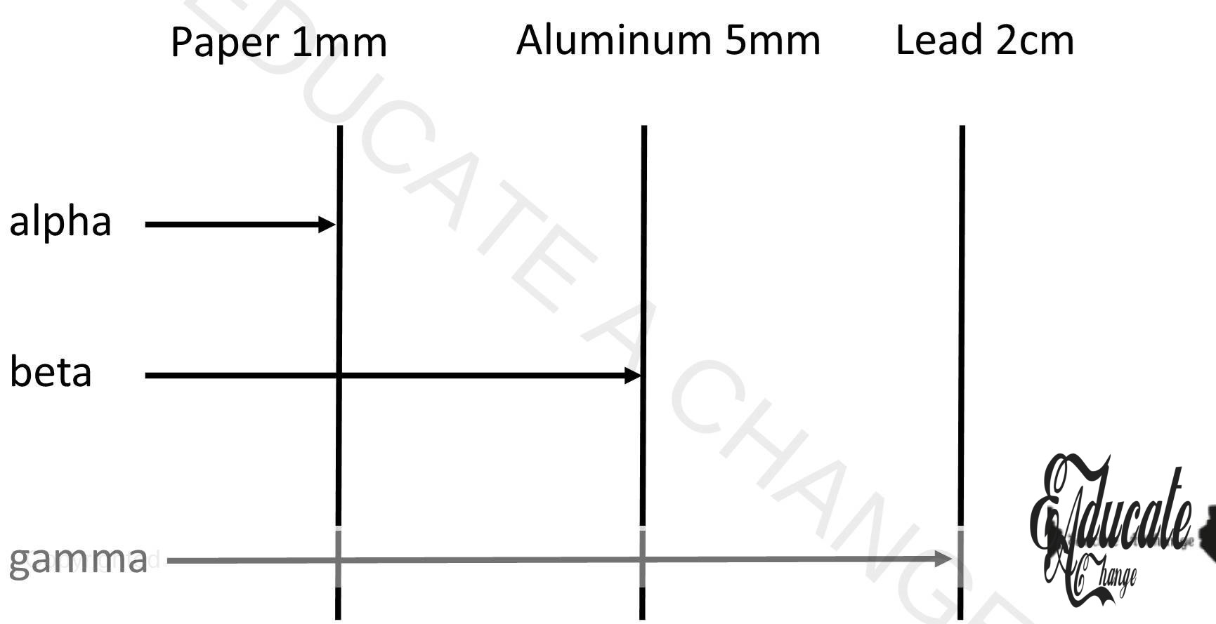 - gamma can pass paper and aluminum so 2cm lead is used to stop it