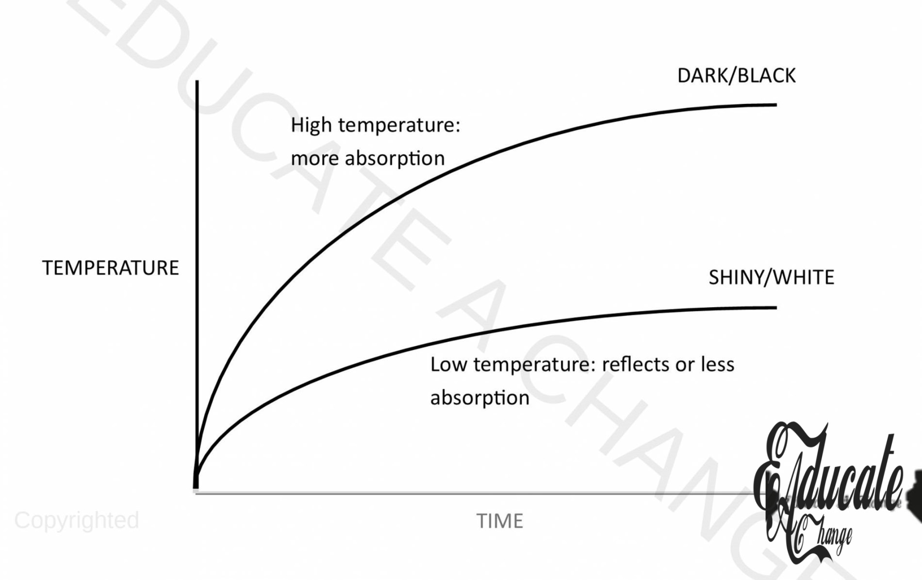 - Black and dull/dark surfaces absorb more rays than the light or shiny surfaces.