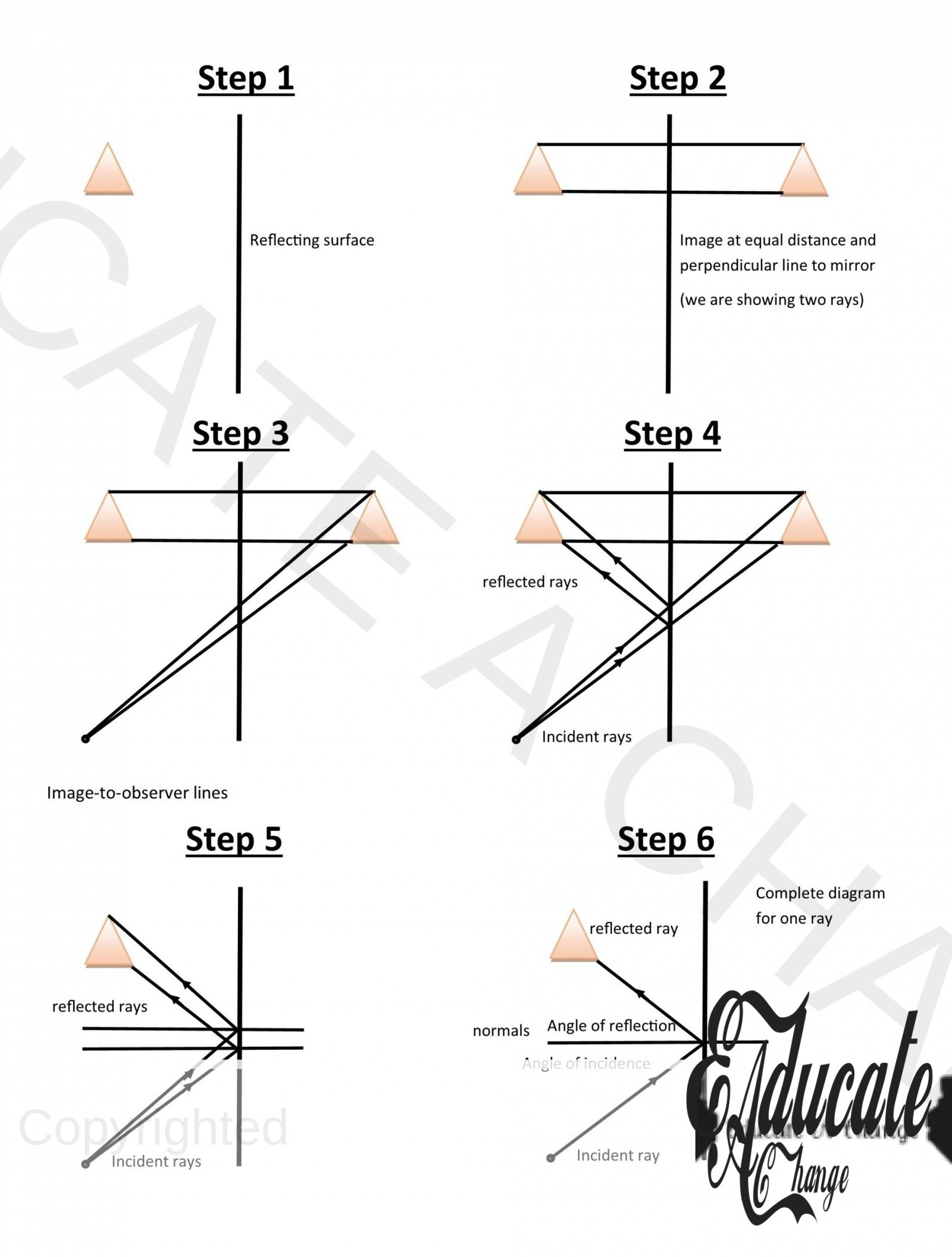 - Join object to the point on the mirror as incidence ray, and the other as reflected ray.