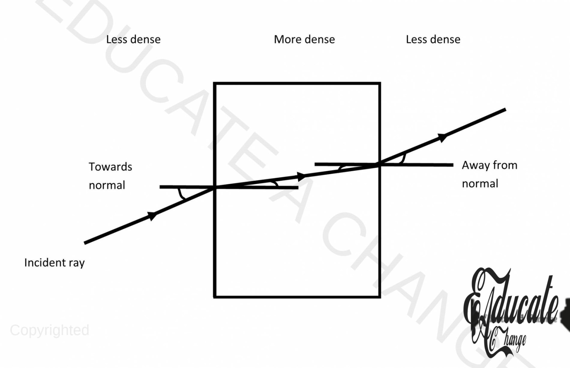 - In dense medium, light’s speed slows down so it bends towards normal.