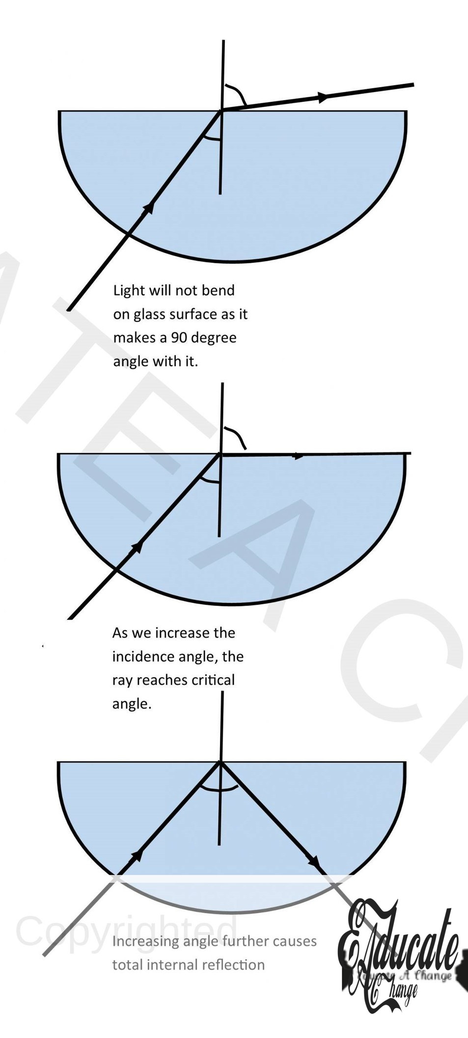 - At 90 degrees, since there is no incidence angle or refraction, light stays at normal.