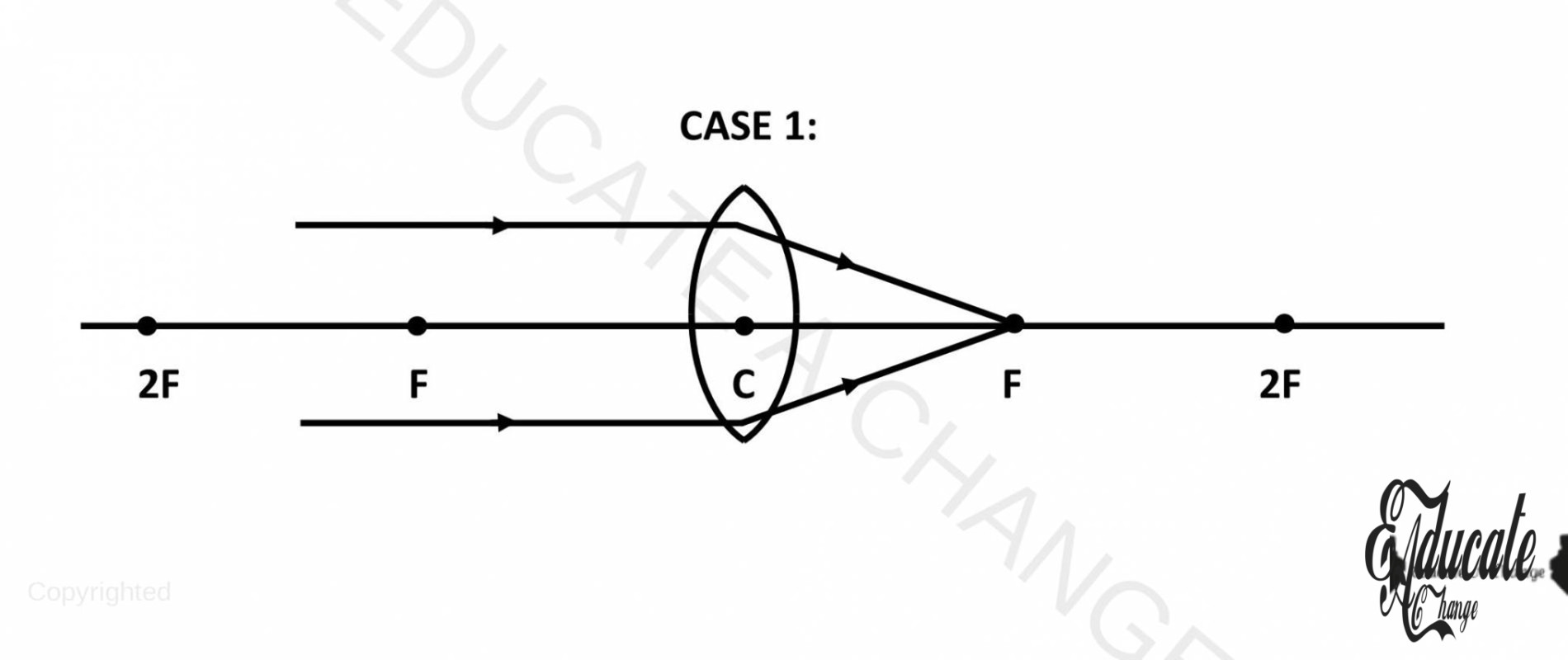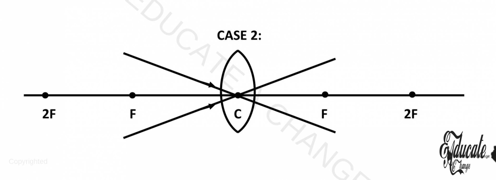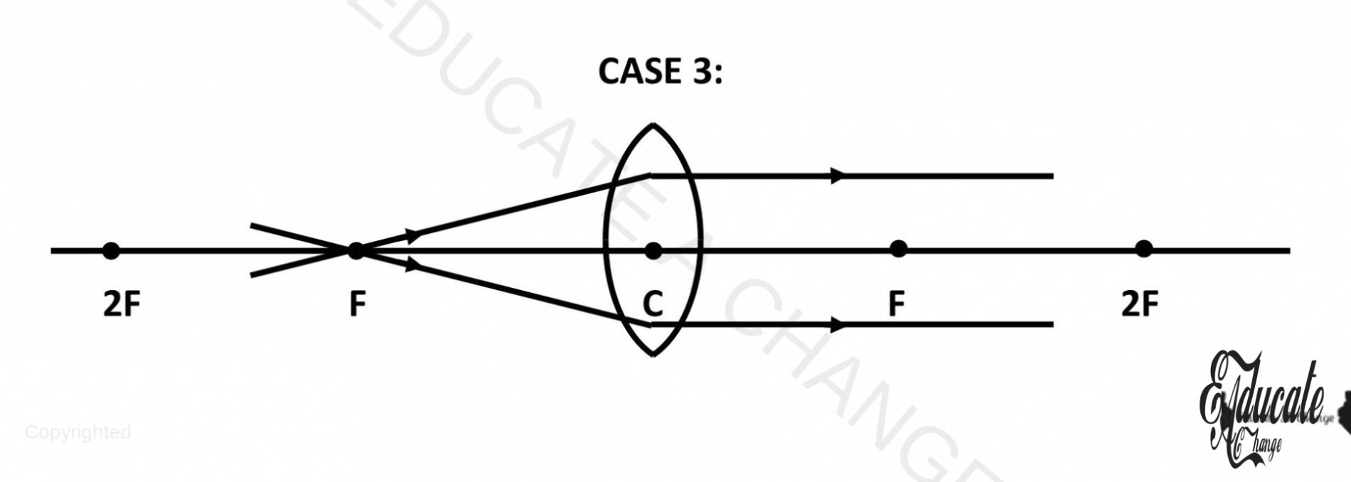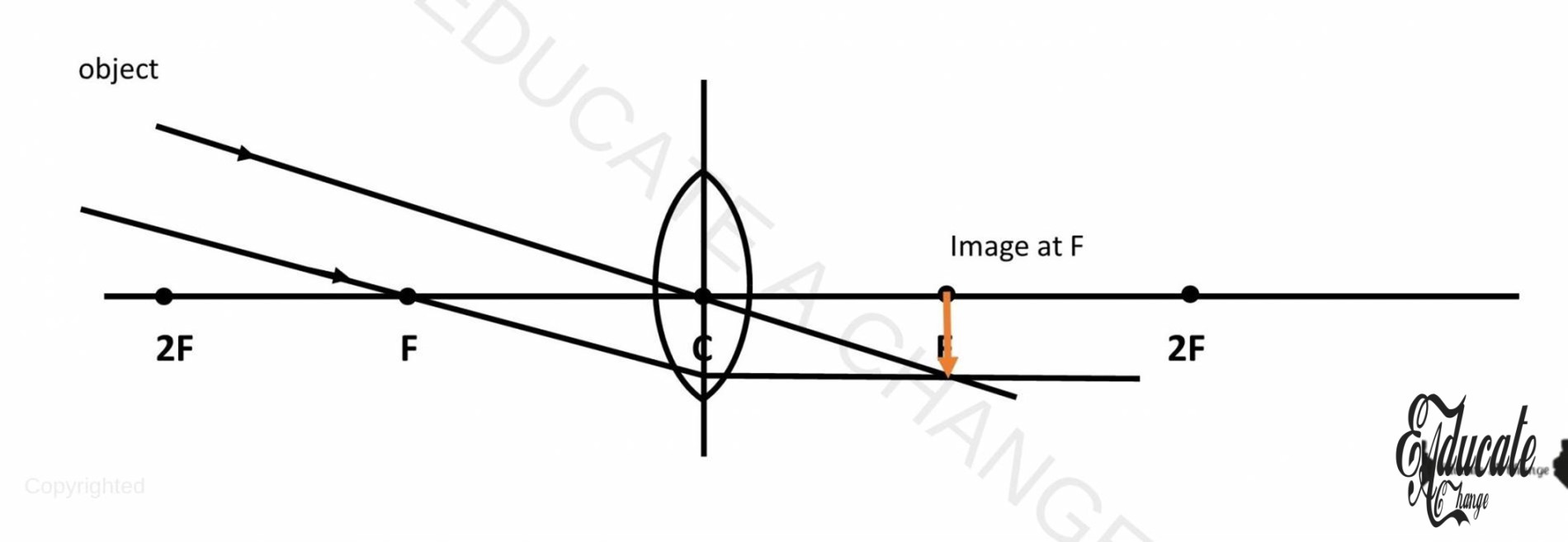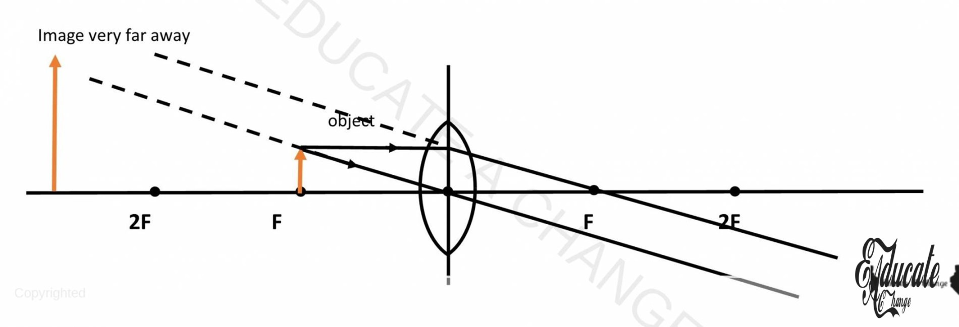 - If we place an object on F, there won’t be any real image since the lines will become parallel and never meet. Only virtual image is created at a faraway place.