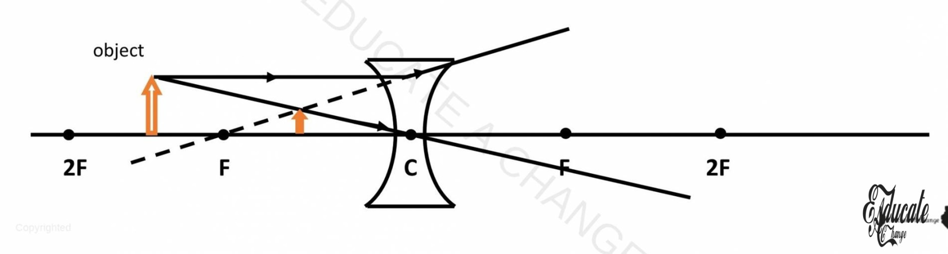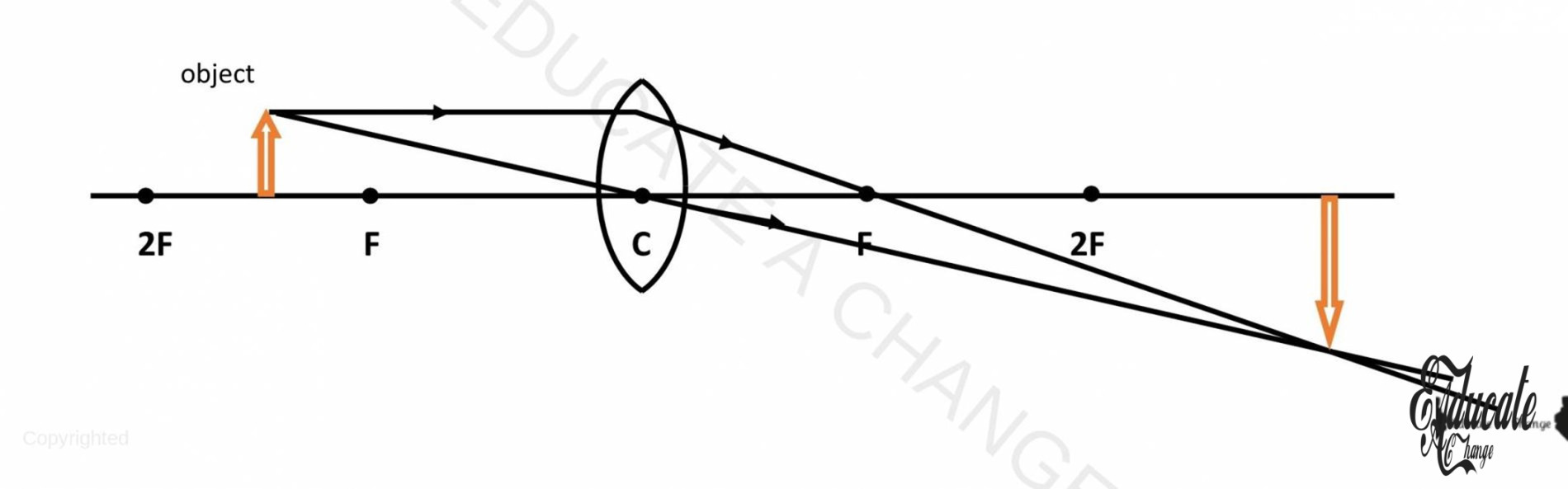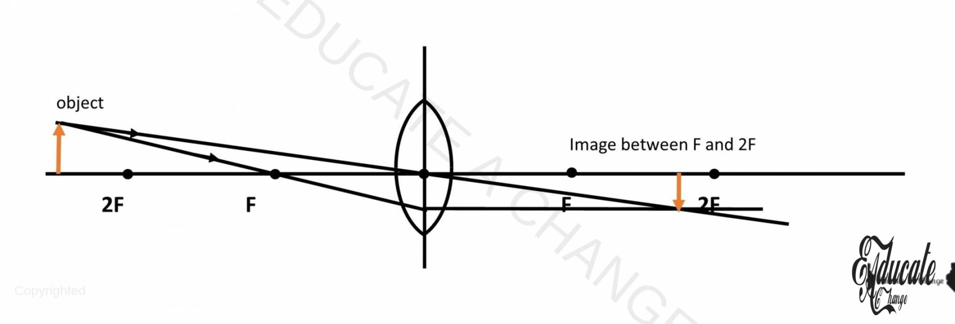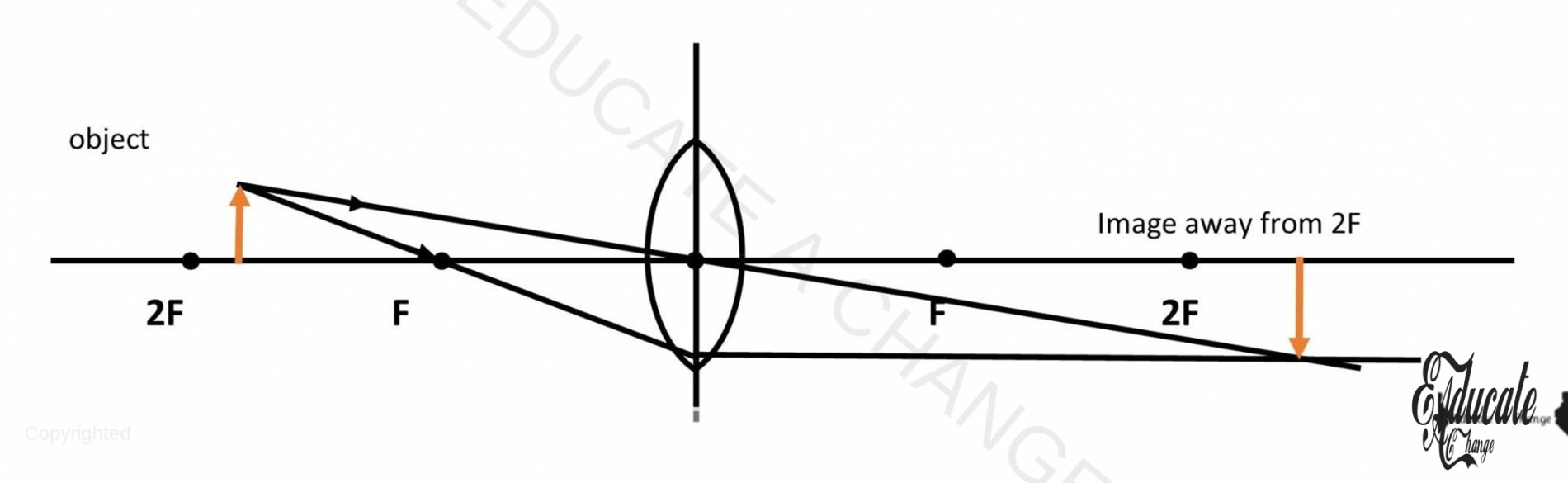 - If we place an object away from 2F, the image will be real, inverted and diminished and between F -2F.