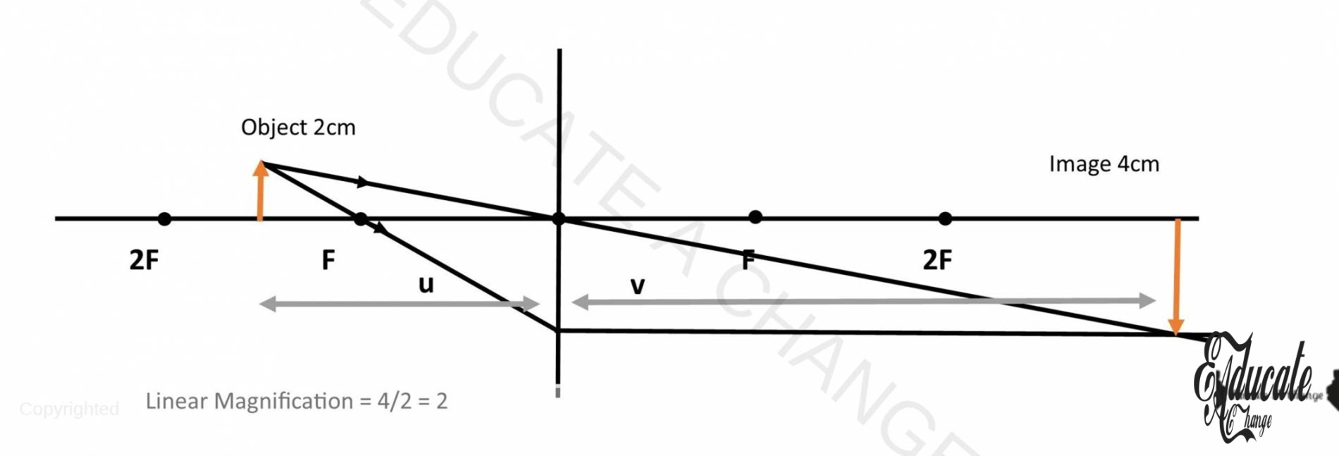For example, here our object was 2 cm and image was 4 cm so linear magnification will be 4/2 = 2.