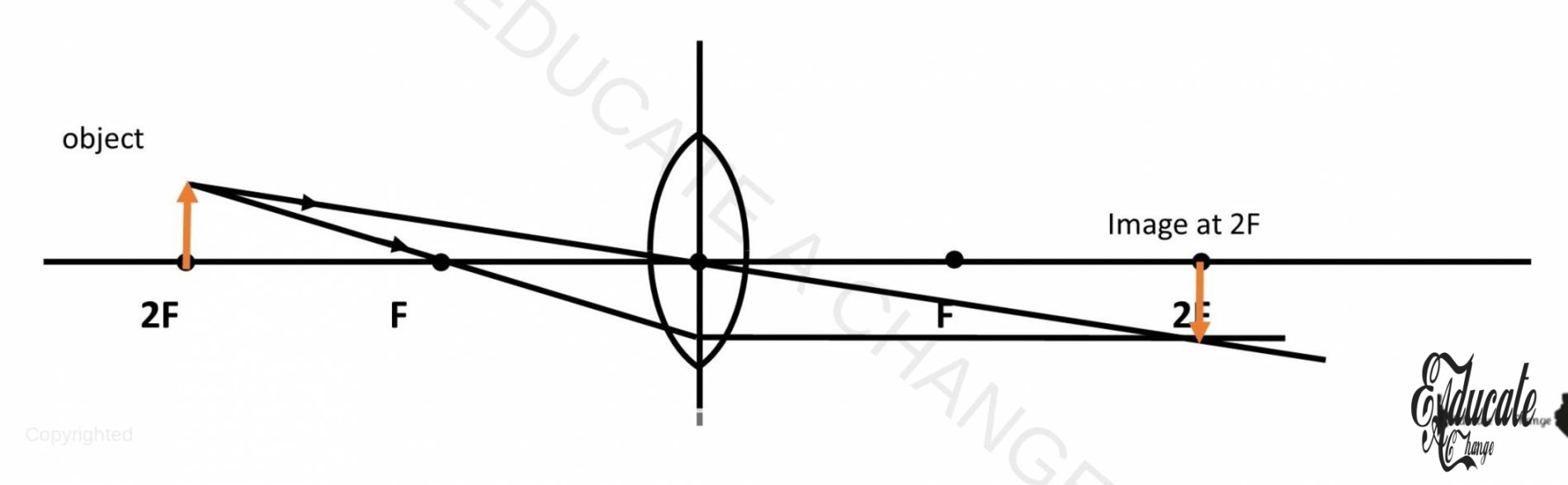 - If we place an object on 2F, the image will be real, inverted and same sized on 2F.