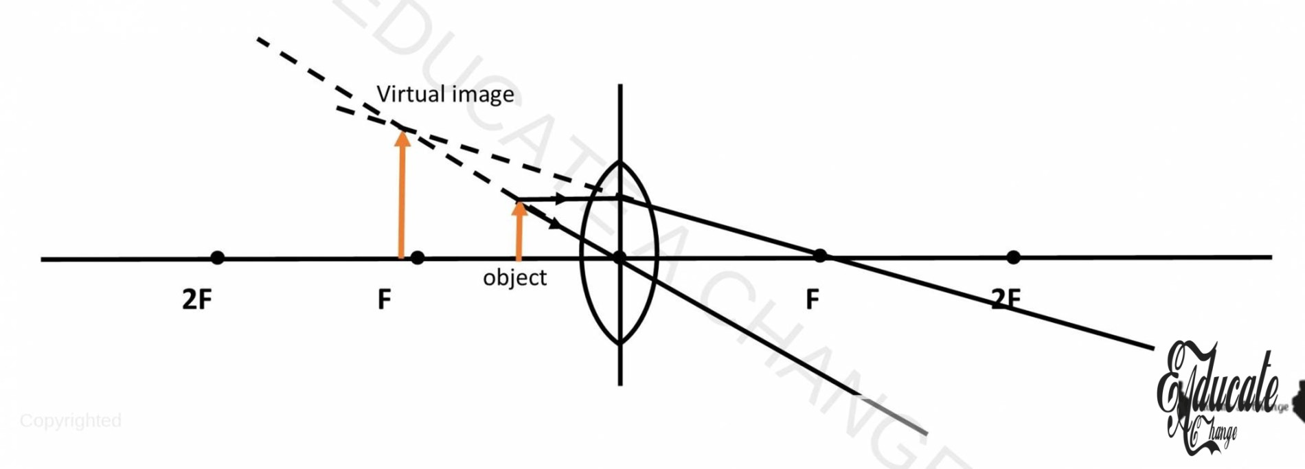 - If we place an object between F and 2F, there won’t be any real image. However, our virtual image will be upright, and magnified.