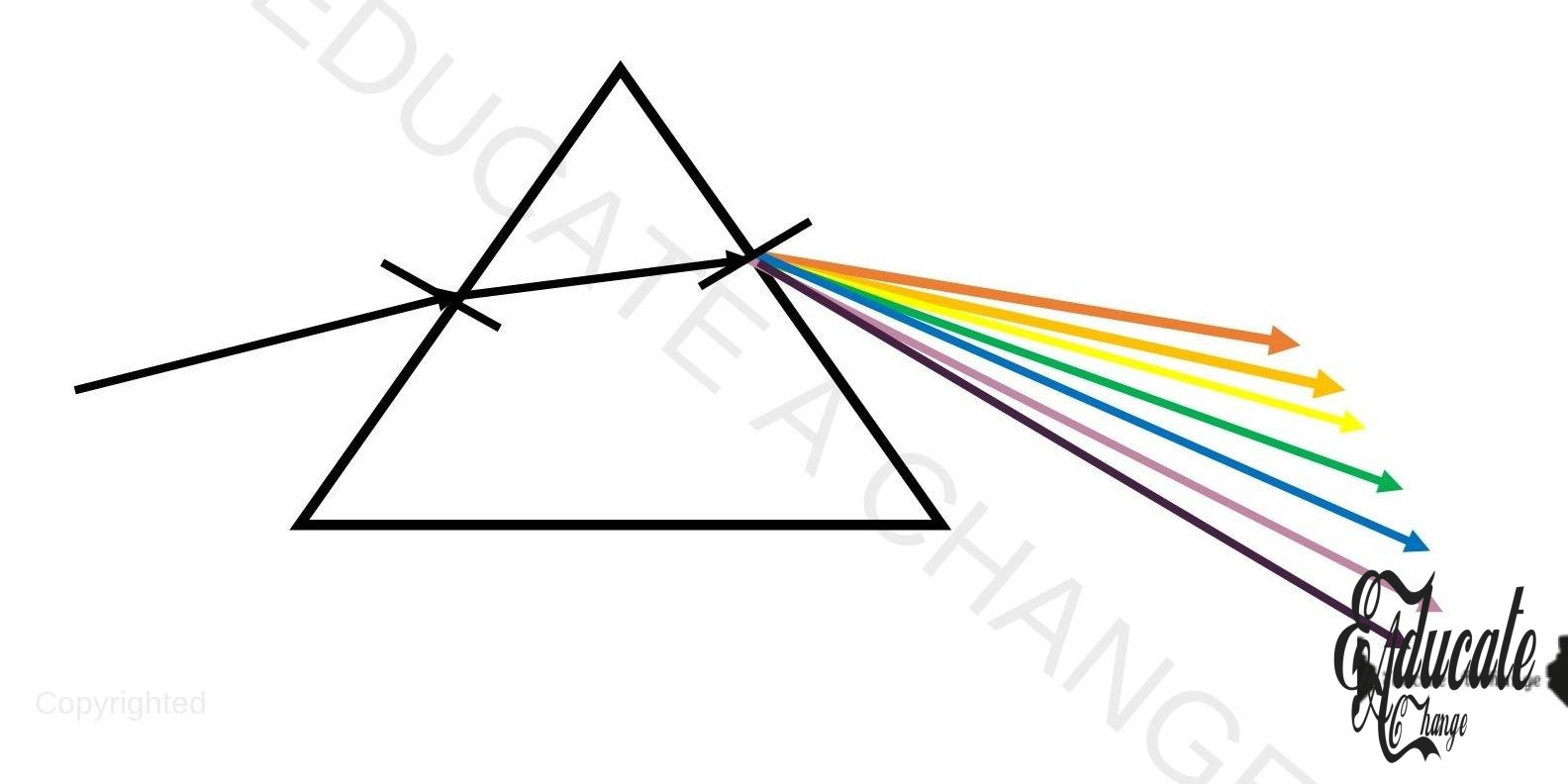 Different colors of light diverge with different angles when they hit a prism, causing white light to split into the rainbow colors. The order of diverging is as follows, starting from the least angle of deviation: